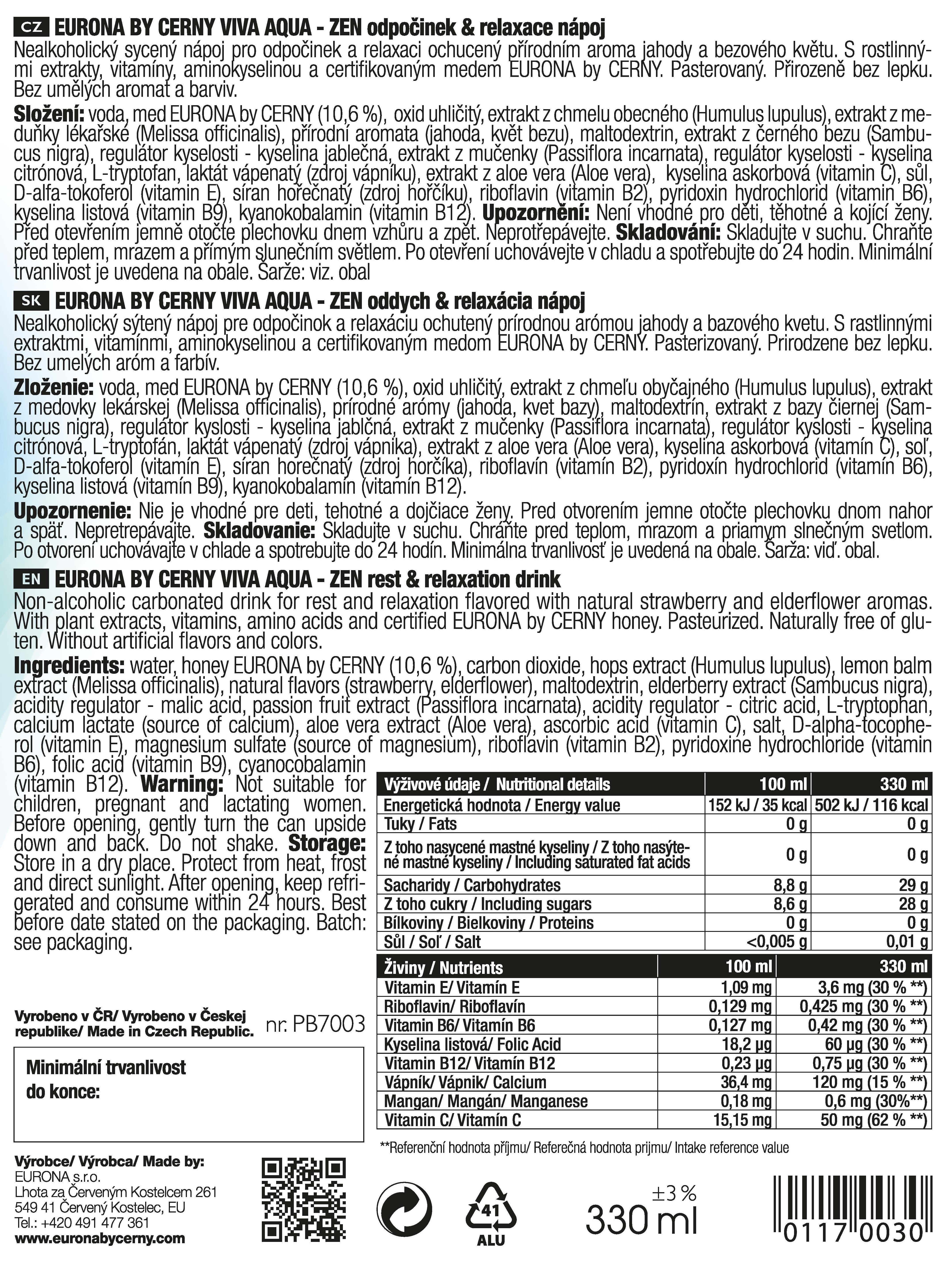 voda, med EURONA BY CERNY (10,6 %), oxid uhličitý, extrakt z chmeľu obyčajného (Humulus lupulus), extrakt z medovky lekárskej (Melissa officinalis), prírodné arómy (jahoda, kvet bazy), maltodextrín, extrakt z čierneho bazy (Sambucus nigra), regulátor kyslosti – jablčná kyselina, extrakt z mučenky (Passiflora incarnata), regulátor kyslosti – citrónová kyselina, L-tryptofán, laktát vápenatý (zdroj vápnika), extrakt z aloe vera (Aloe barbadensis), kyselina askorbová (vitamín C), soľ, D-alfa-tokoferol (vitamín E), síran horečnatý (zdroj horčíka), riboflavín (vitamín B2), pyridoxín hydrochlorid (vitamín B6), kyselina listová (vitamín B9), kyanokobalamín (vitamín B12)